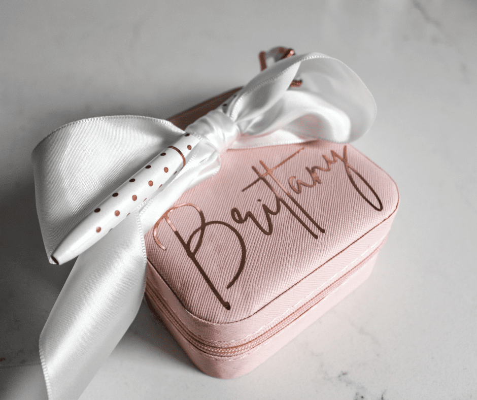 Custom name decal on the front of the box in popular rose gold shade