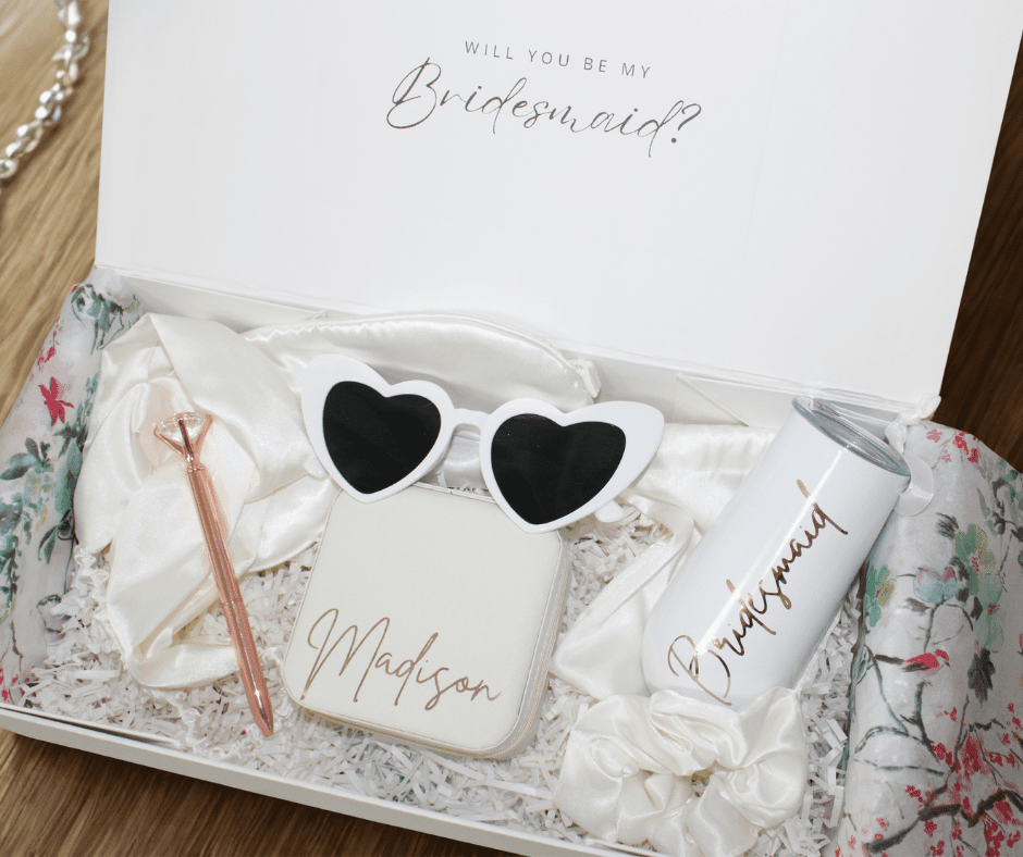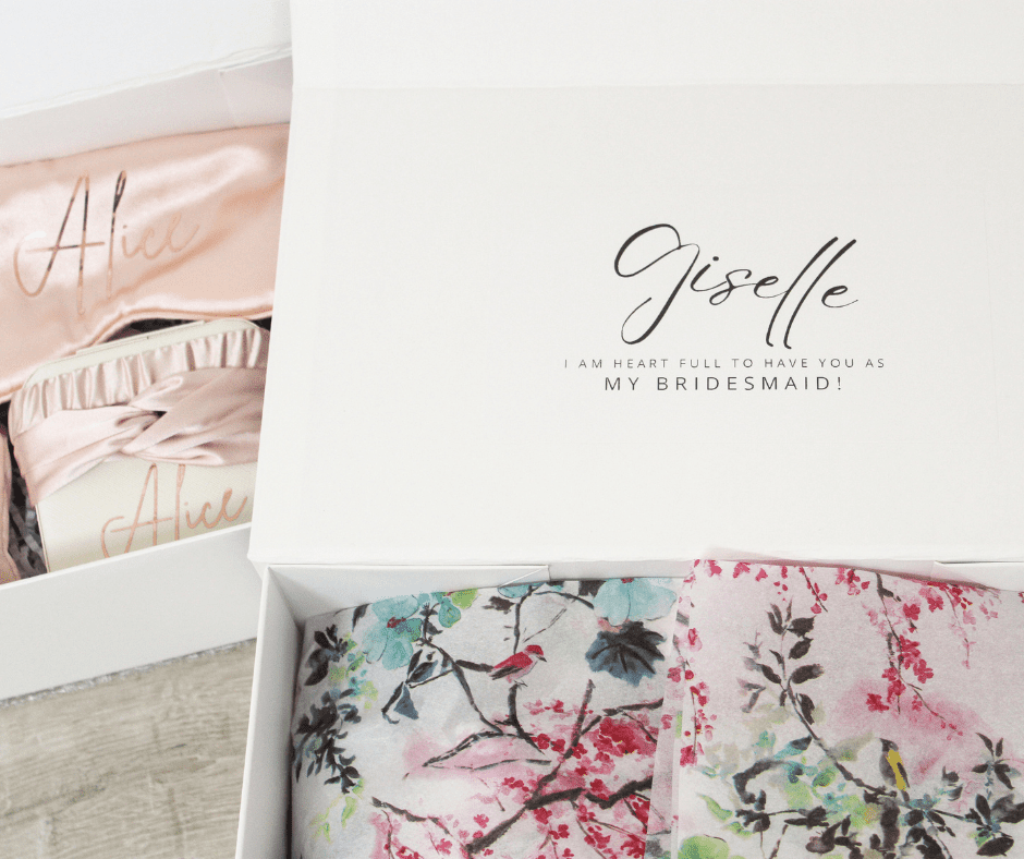 Beautiful, white personalised magnetic-close gift box with paper shred & tissue paper from Ribbon & Blues with each person’s name and role (e.g. Will you be my Maid of Honour?)